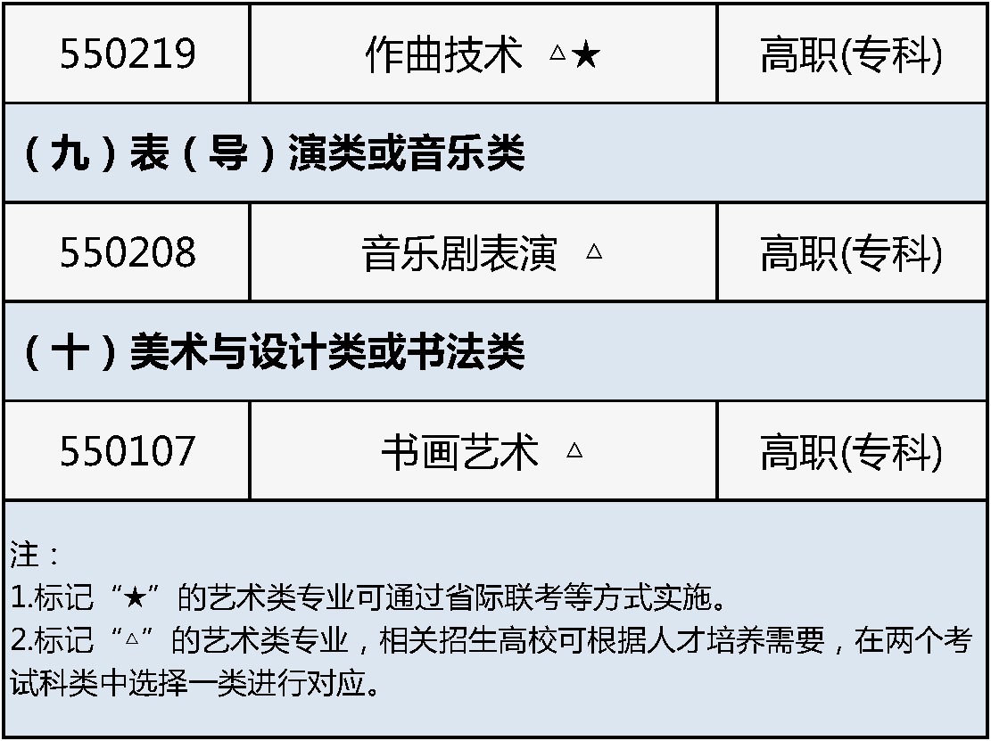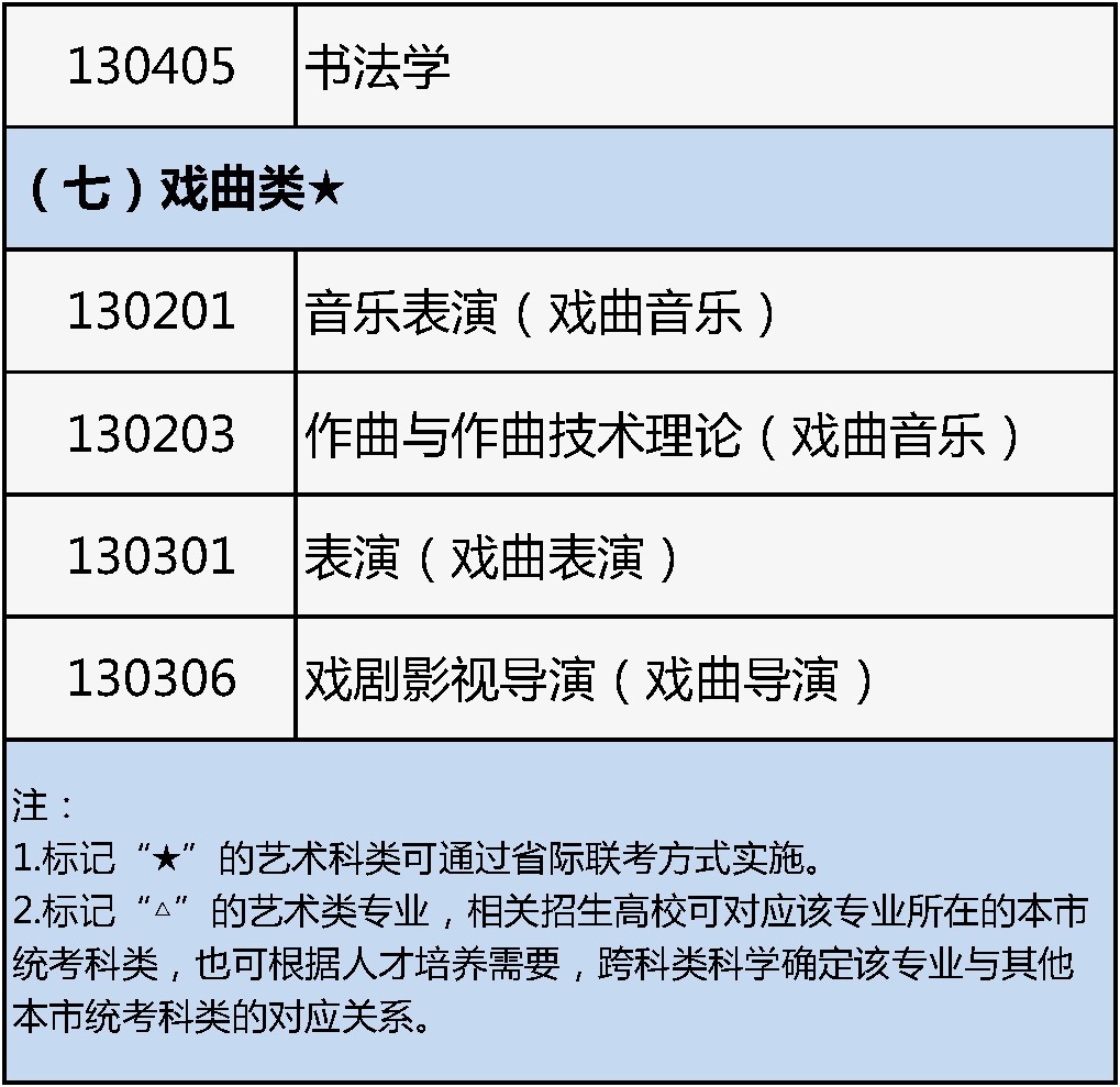 r2.7个艺术类考试科类下设的艺术类专业招生实行“文化素质+专业能力”的考试评价方式。招生高校可根据自身办学定位和人才培养实际,对考生专业能力提出艺术科类相对应的专业要求,并使用北京市统考成绩、省际联考成绩或高校校考成绩作为专业成绩进行录取。专业目录中标记“★”的科类为戏曲类,可通过省际联考方式实施,标记“△”的艺术类专业,相关招生高校可对应该专业所在的本市统考科类,也可根据人才培养需要,跨科类科学确定该专业与本市统考科类的对应关系。