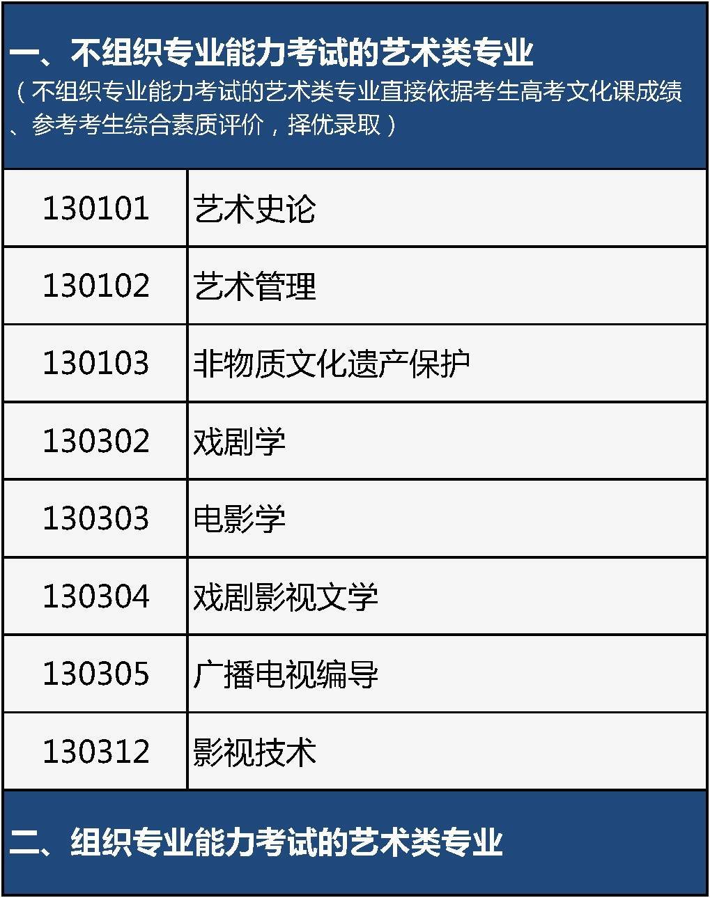 r1.教育部《普通高校艺术类考试招生本科专业目录》中艺术史论、艺术管理、非物质文化遗产保护、戏剧学、电影学、戏剧影视文学、广播电视编导、影视技术8个专业和《北京市高等职业教育艺术类考试招生本科和专科专业目录》中数字广播电视技术、影视编导等16个专业,不再进行艺术类专业能力考试,直接依据考生高考文化课成绩,参考考生综合素质评价,择优录取考生。